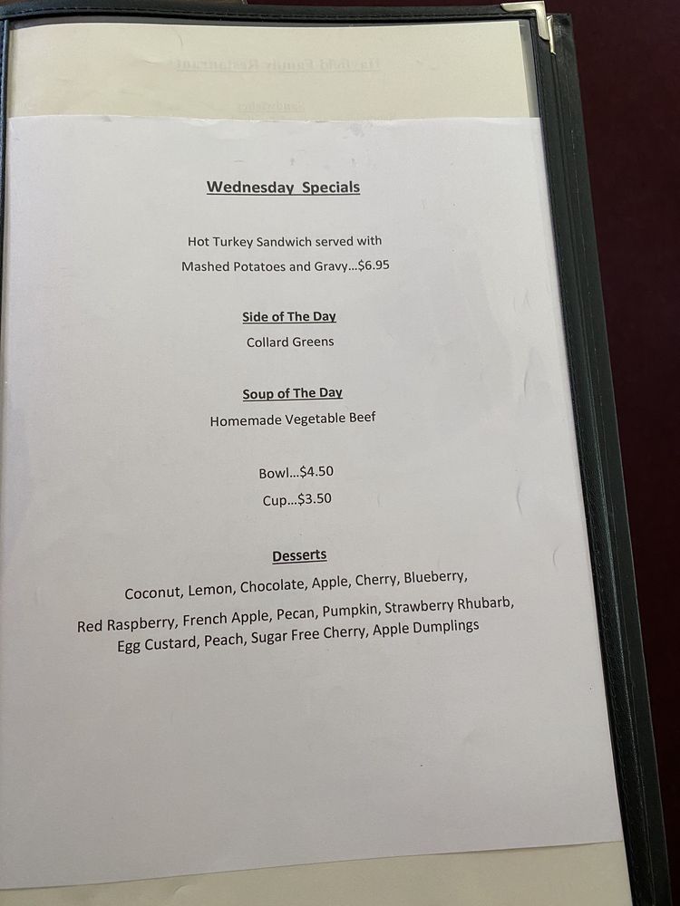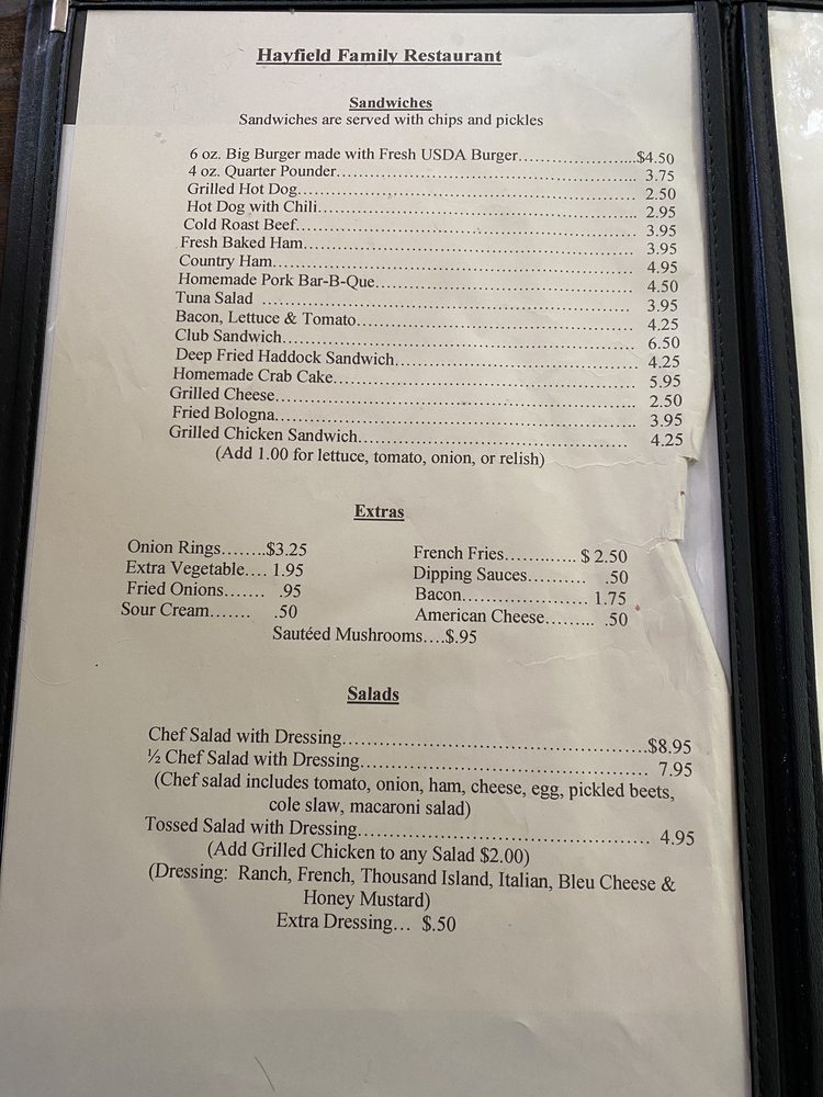 Hayfield Family Restaurant, located in Gore, VA, offers a cozy, family-friendly atmosphere perfect for those looking for classic American breakfast and brunch options. The restaurant provides a range of amenities including takeout, delivery, and Wi-Fi, making it convenient for diners. Customers rave about the friendly staff, affordable prices, and delicious homemade food. From fresh pies to hearty salads, the menu offers a variety of options for all tastes. With positive reviews highlighting the generous portions, welcoming service, and nostalgic vibe, Hayfield Family Restaurant is a must-visit for those seeking a comforting dining experience. Whether you're a local looking for a favorite spot or a traveler passing through, this establishment promises a satisfying meal in a relaxed setting.